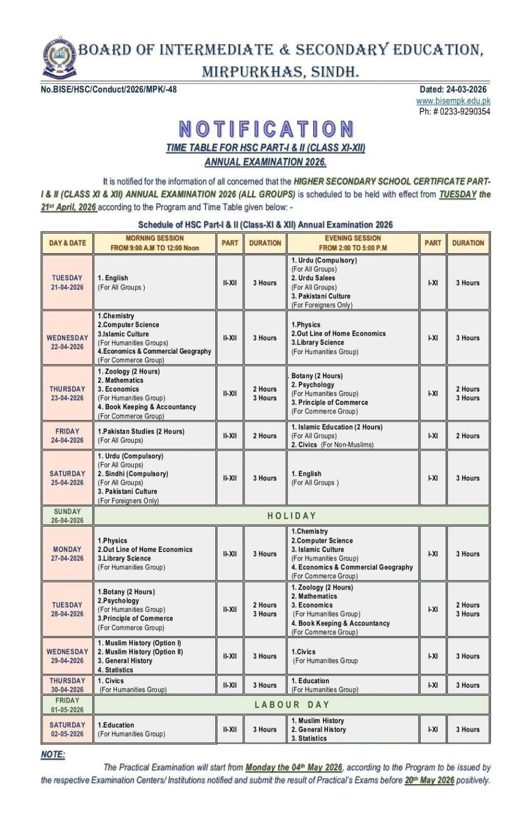 1st year Date Sheet 2026 bise mirpurkhas